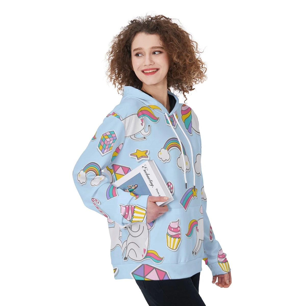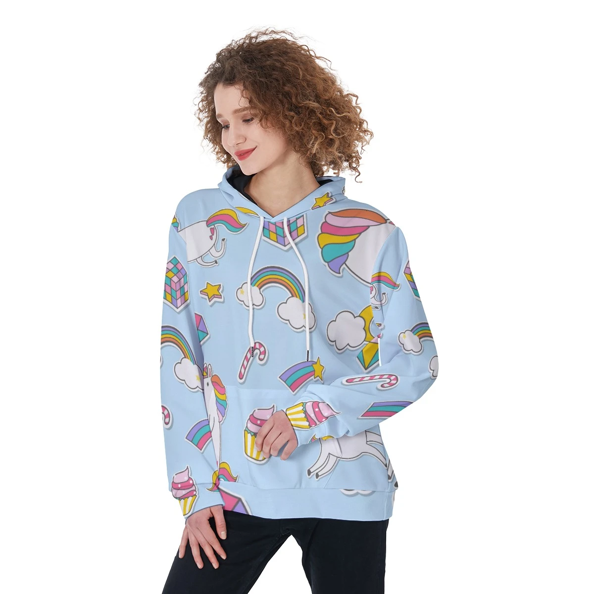 - White drawstring, front pocket and black inner hood