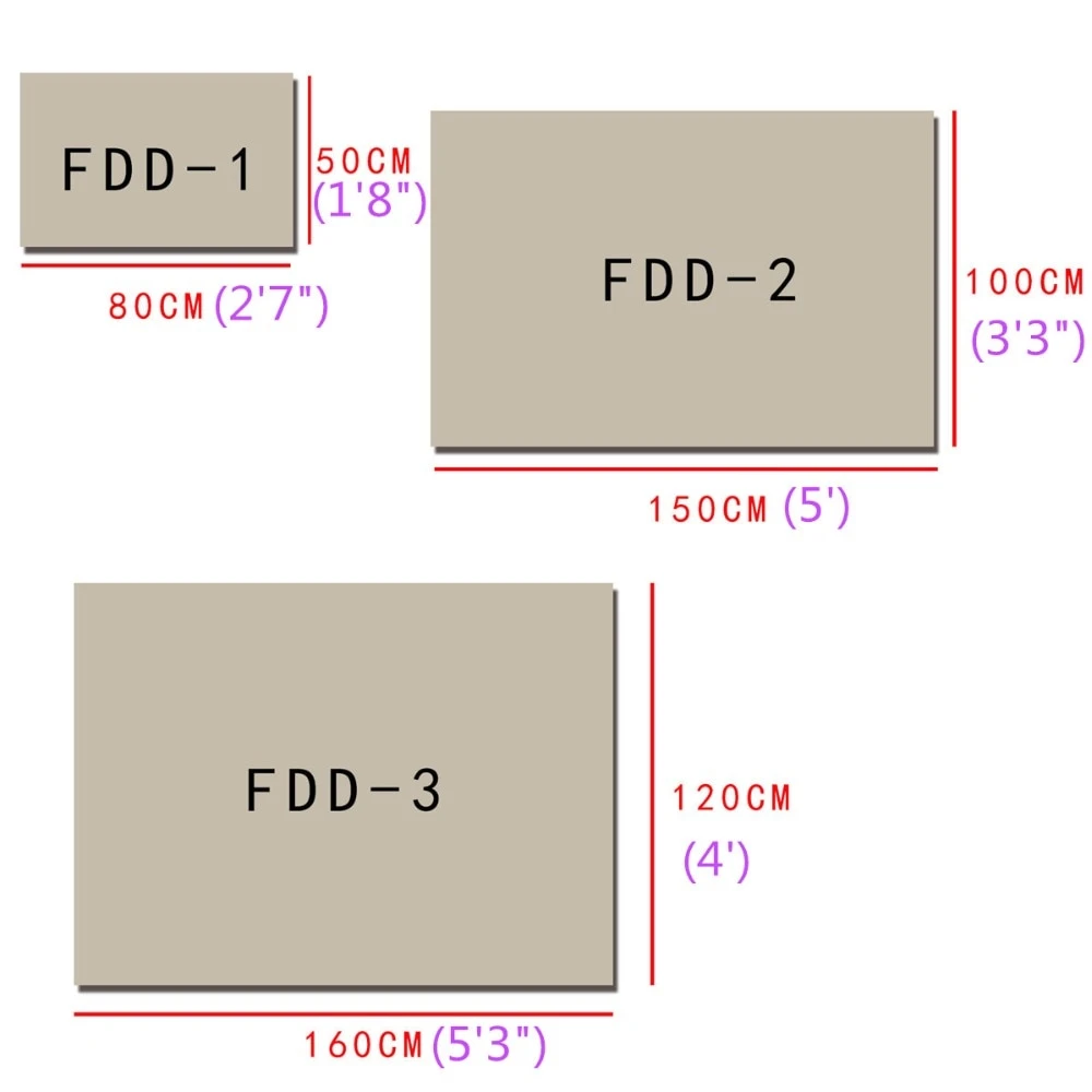 - Size: 2’7″W X 1’8″L(80cm W x 50cm L) | 5’W X 3’3″L (150cm W x 100cm L) | 5’3″W X 4’L (160cm W x 120cm L)