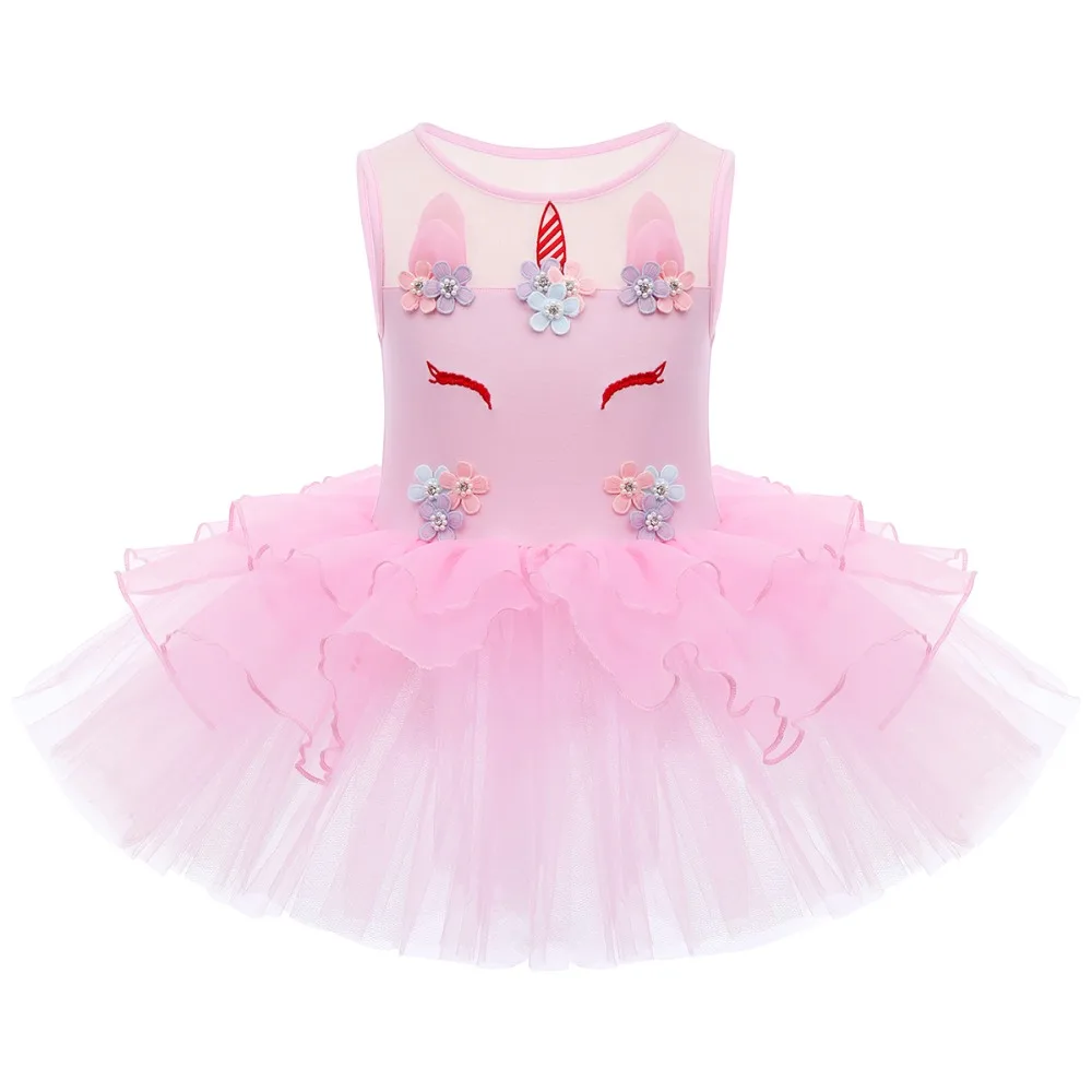 - Child girl princess unicorn ballet tutus dress embellished with unicorn pattern, flowers, beads and faux rhinestone decoration at front. These sweet camisole ballet dresses feature round neck sleeveless top, illusion neckline, easy to put on and take off; Great as ballet performance and daily training dance class gymnastics dance dress. It’s also great as birthday cake smash costume for photo props;