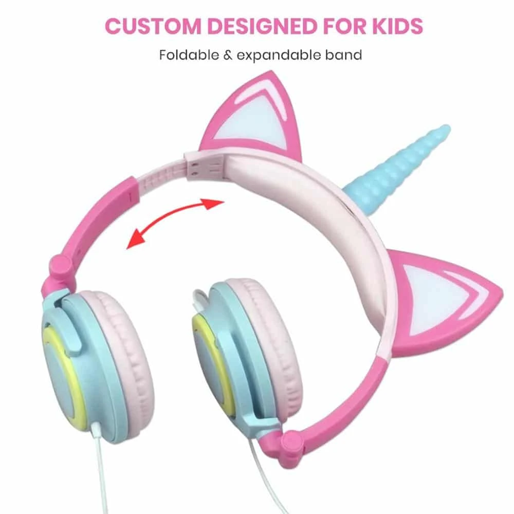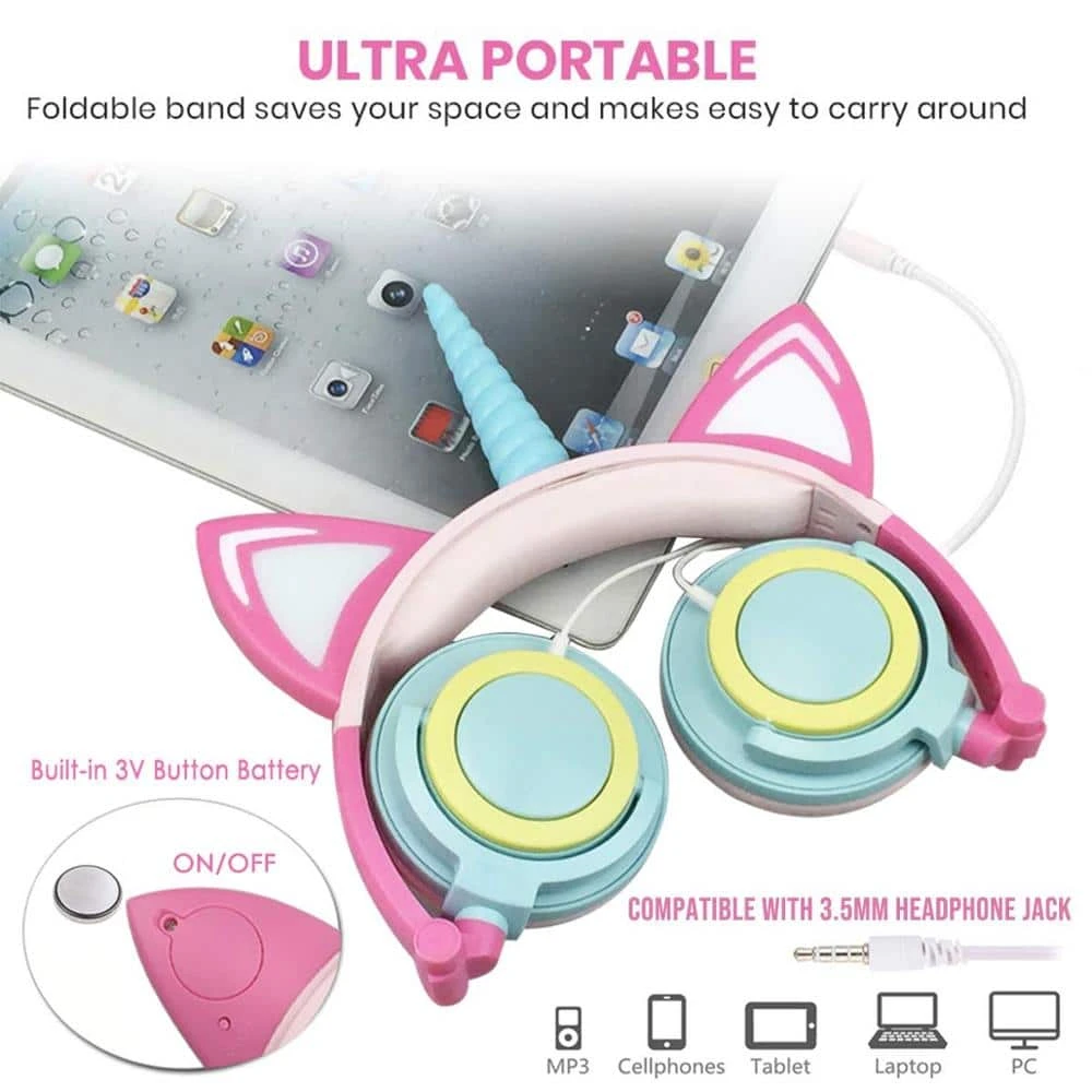 - [Glowing Ear & Horn Light]-Unique design with Cat Unicorn Ear Headphones.Headphones with glowing light on the two cat ears and a horn of unicorns, colorful and attractive flexible features which are perfect as a gift for friends, kids or cosplay fans. The lights on the headphones can be turned on or off or flashing with the push of a button.