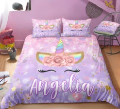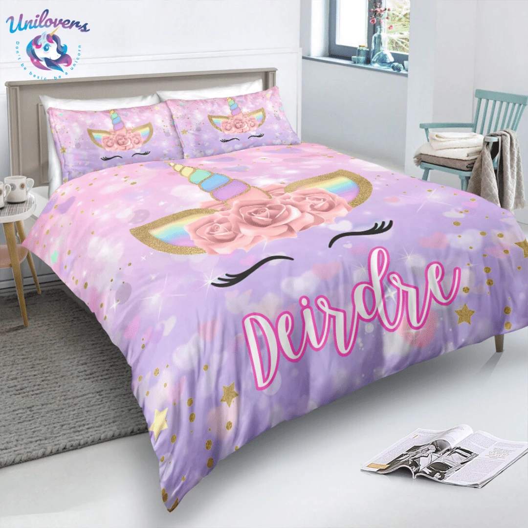 Personalized unicorn bedding with a name will definitely make your little girl jump on her bed for a good night sleep.