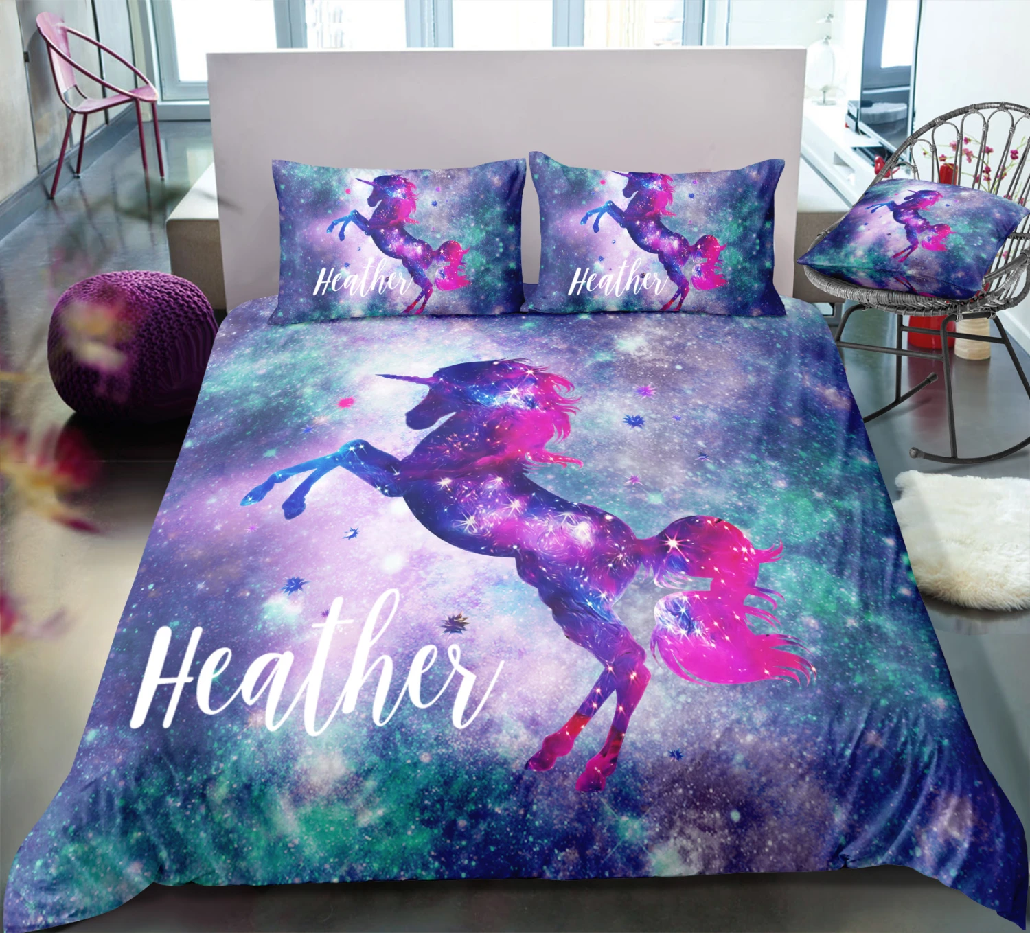 Personalized galaxy unicorn themed bedding with a name will definitely make your little girl jump on her bed for a good night sleep.