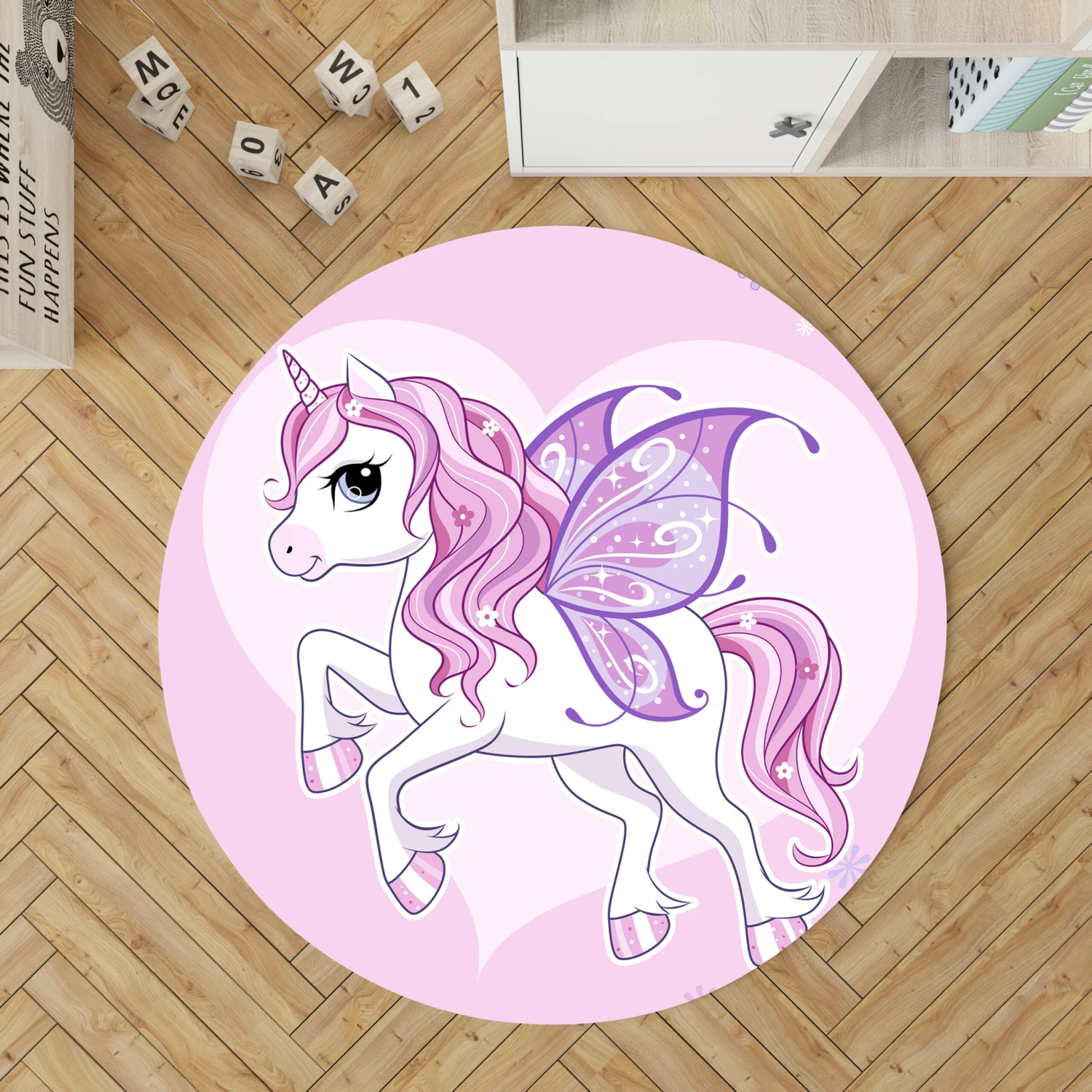- DESIGN- Round shape, sumptuously soft surface, non-skid latex backing, long-wearing edge, topped with a printed Colorful unicorn pattern
