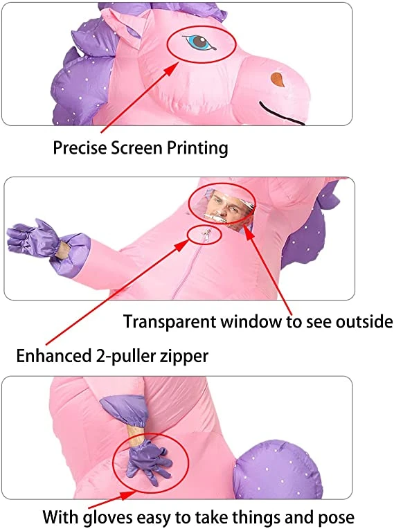 inflatable costume Inflates in seconds, easy to deflate, and storage. When deflated, the volume is very small. - BE THE WINNER OF EVERY COSTUME CONTEST: Get ready for this year’s Halloween with these truly unique and hilarious inflatable costumes. Choose one of the 5 colors and win every costume contest! Dress up as Unicorn, and draw everyone’s attention on you!