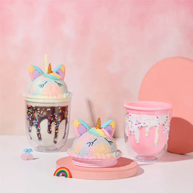 - Colorful sweetness! This plastic bottle is designed with a blushing unicorn with a glittery mane, a purple lid with 3D ears and horn, complete with a straw