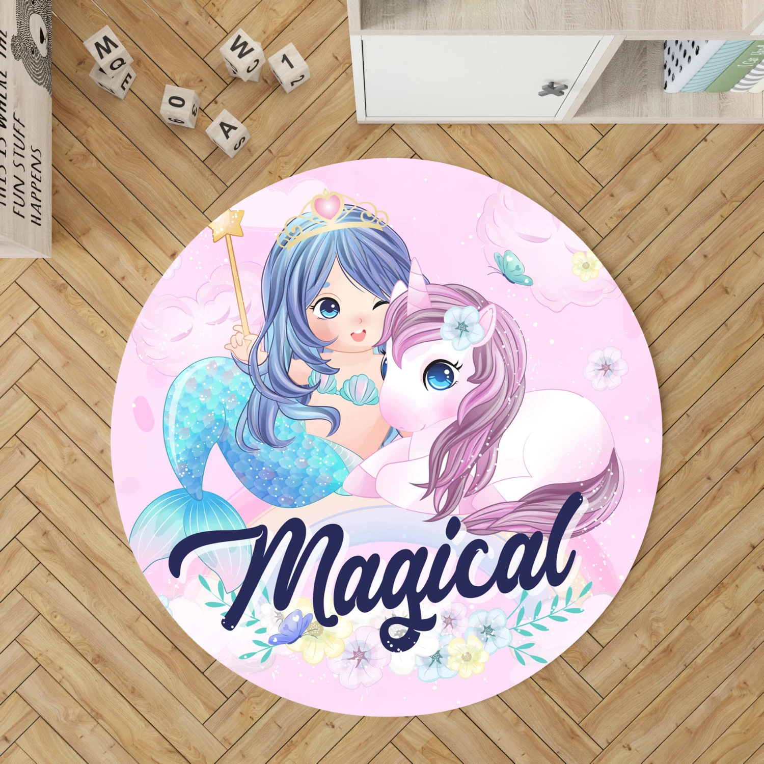 - DESIGN- Round shape, sumptuously soft surface, non-skid latex backing, long-wearing edge, topped with a printed Colorful unicorn pattern