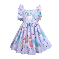 Baby Girls Summer Dress Blue Unicorn Pretty Children Casual Clothes Cotton For Kids 2-7 Year