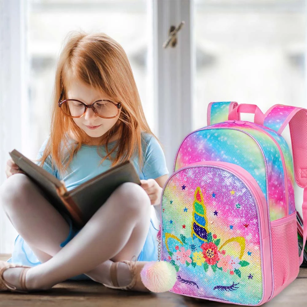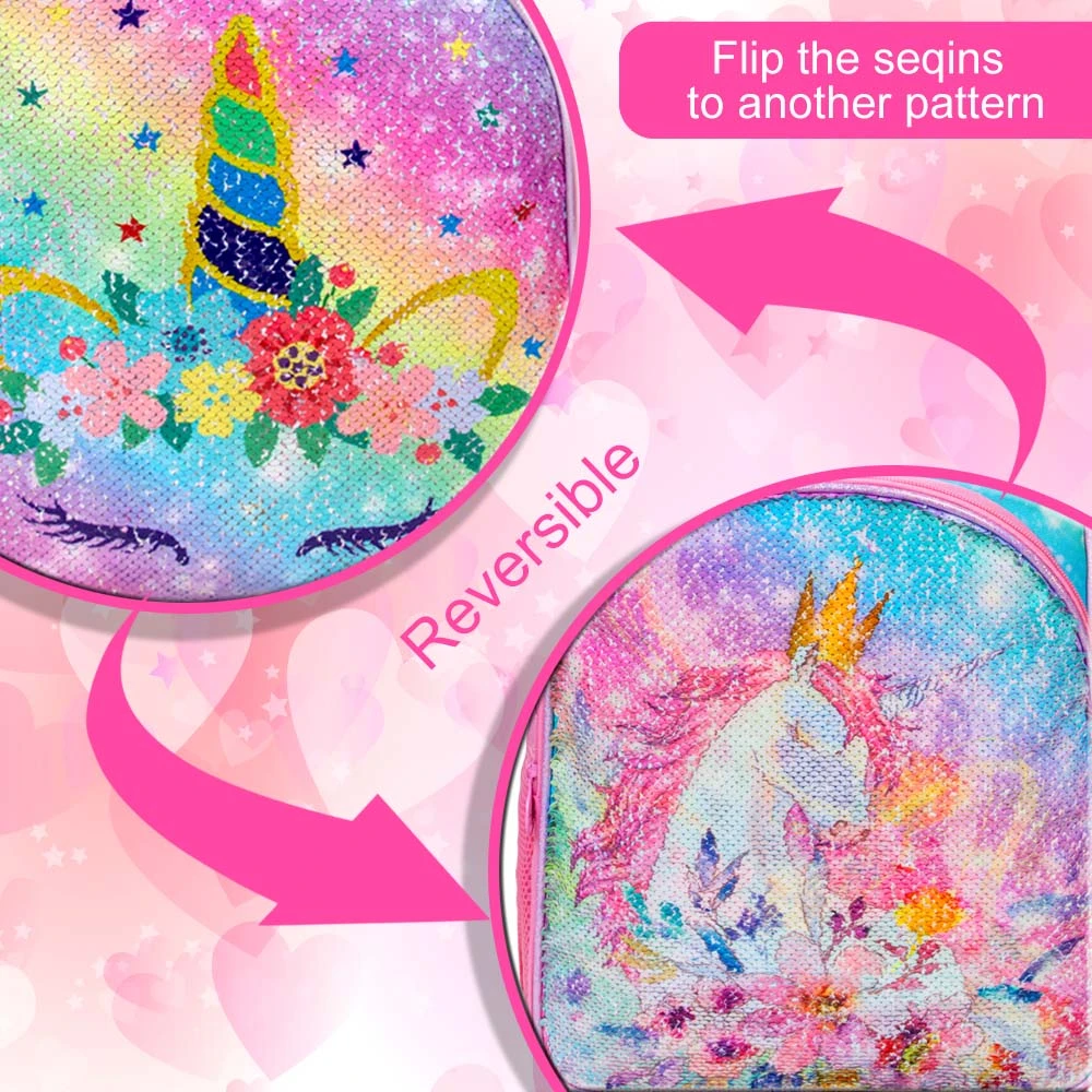 - Girls Backpack 4 in 1: Unicorn Sequin Backpack + Lunch bag + Pencil case + soft furry pom, soft polyester material, smooth zipper, widened and thickened shoulder straps make it feel nice and comfortable.