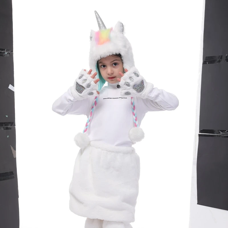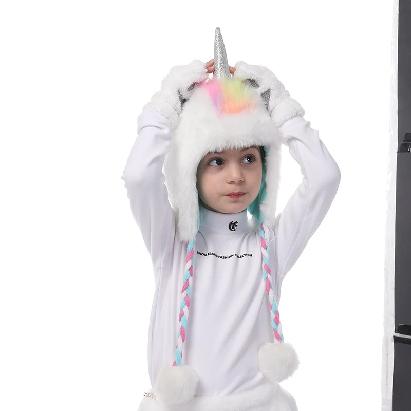 Look super magical while staying super cozy! This pink faux fur hooded scarf features a unicorn design with a glitter horn and ears on top of the hood, mitten pockets, and a rainbow pattern on the inside. This scarf will definitely make your little girl warm & cozy all day long.