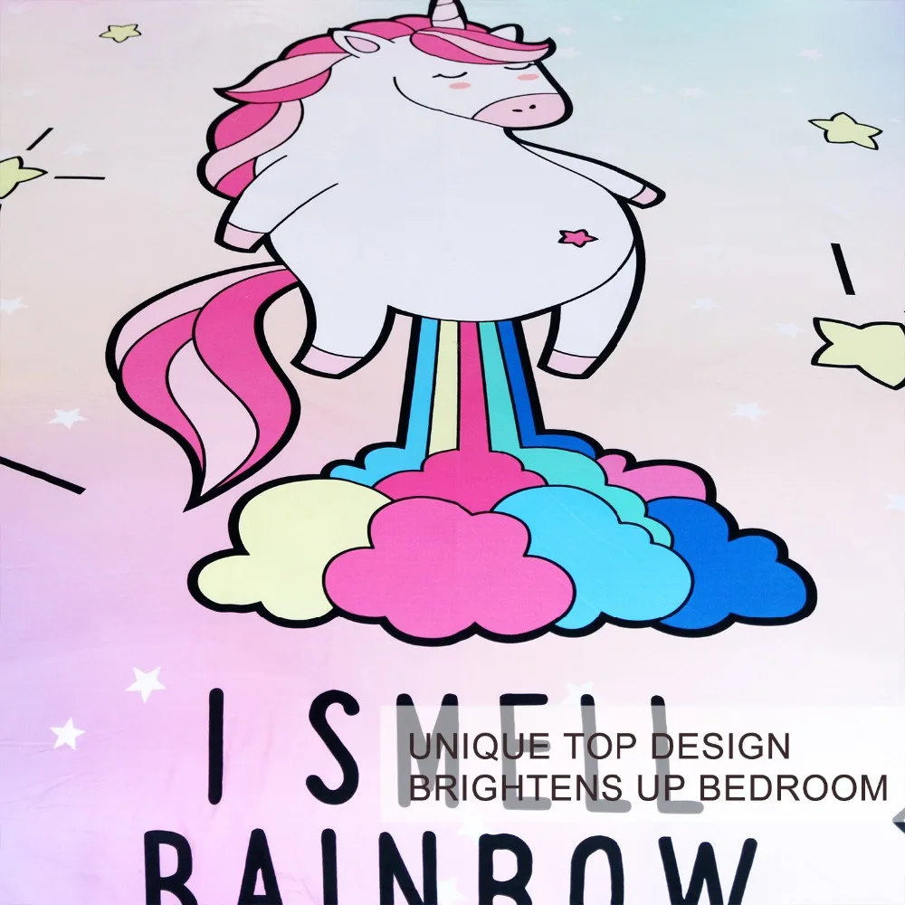 - RAINBOW UNICORN PATTERN – A fat unicorn with pink hair flying to the starry sky with the power of rainbow fart, funny and cute. What a fun way to decorate your little one’s bedrooms…especially if they love rainbows, cartoons, and unicorns.