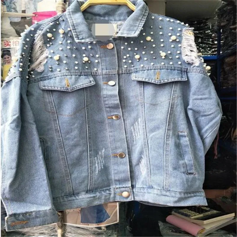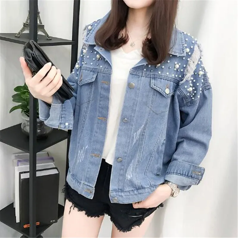 - Long sleeve, Turn down collar, pearl beading, button up denim jacket.