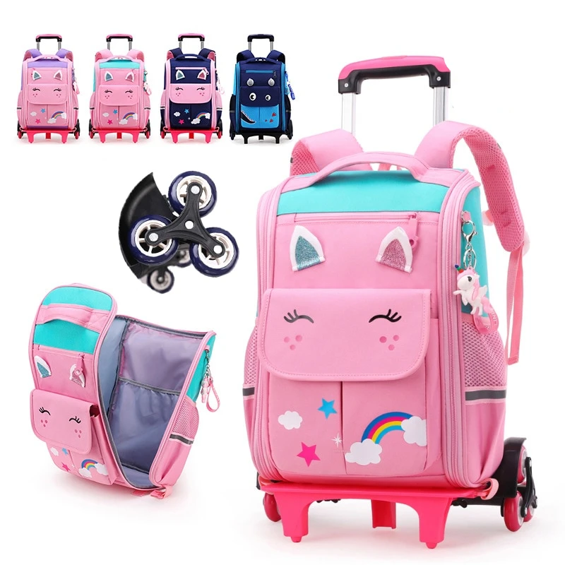 - Girls unicorn rolling backpack capacity:1 large main pocket adopt with 1 laptop compartment;2 zipper front pockets for IPAD/A4 size items;2 mesh pockets for water bottles;1 special pencil case which can hang on the backpack;1 lunch bag with adjustable straps which can be as a shoulder bag or a handle bag.