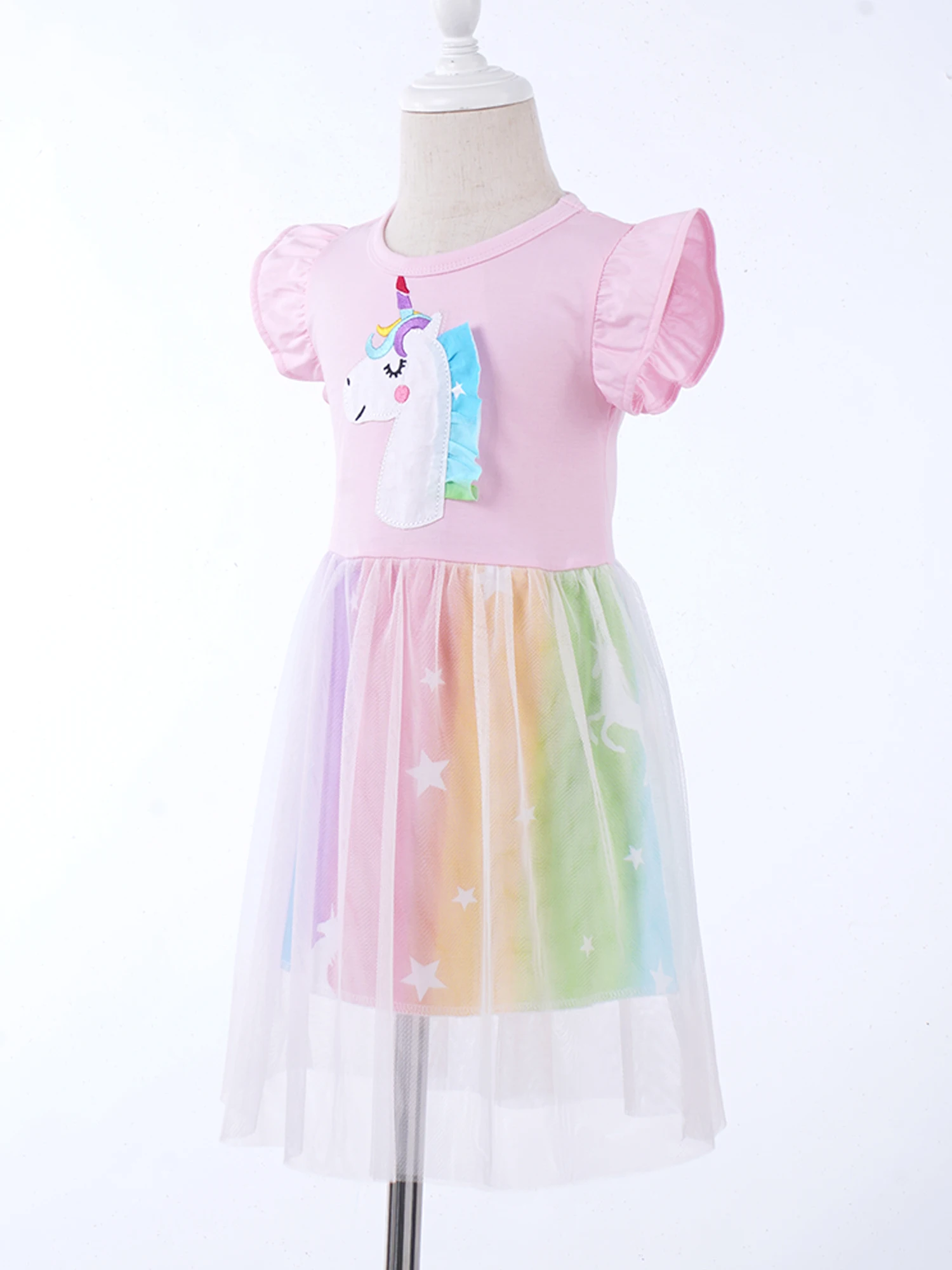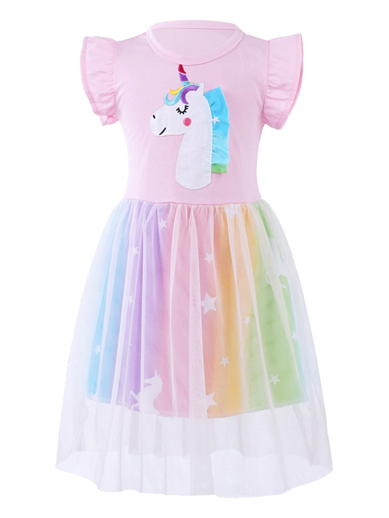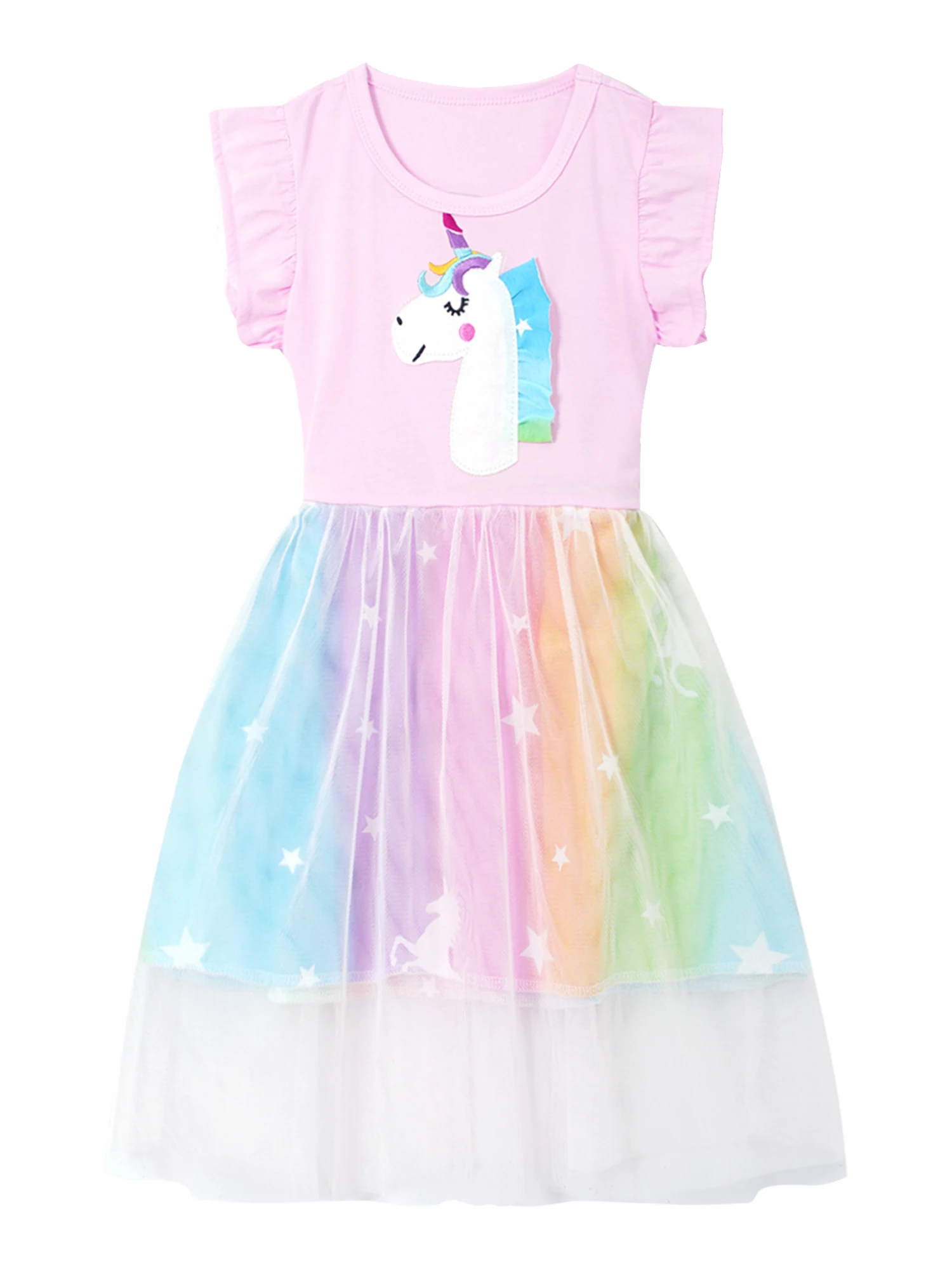 The dress features with ruffle short sleeve and regular round neckline, cute cartoon print, or sequins decorated in the front.